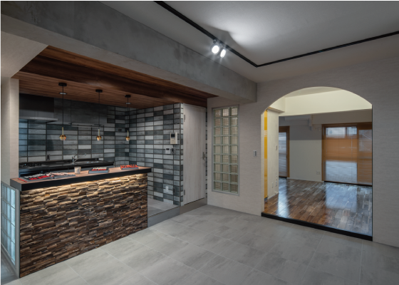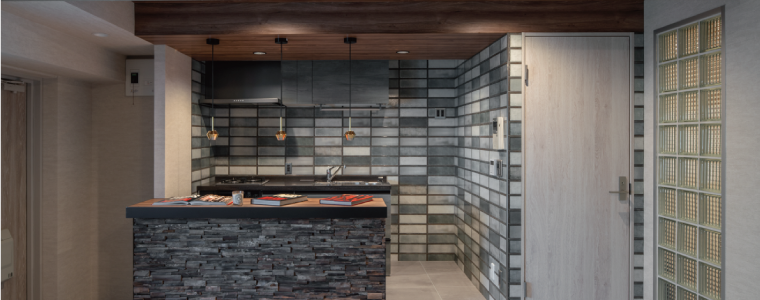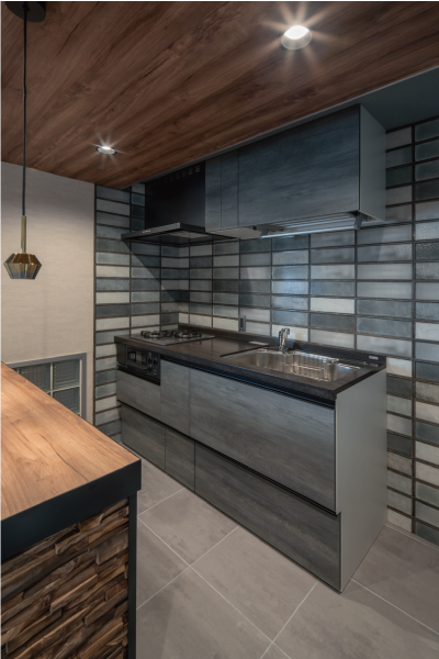 シックな色のタイルで彩られたキッチン。背面にはウッドパネルが目を引くカウンター。