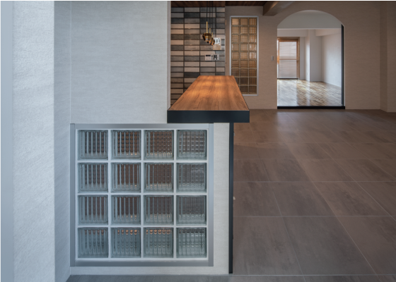 間接照明、ペンダントライト、電気の光でキラキラと光を反射するガラスブロック。こだわりが詰まったこのスペースはスタジオのアクセントになってくれます。