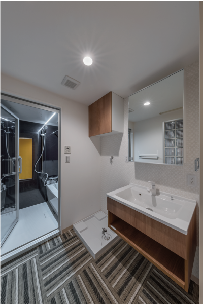 パッと目を引く鮮やかな黄色の扉を潜ると、脱衣所。 洗面台の鏡の裏は棚になっているので、小物もすっきりと収納出来ます。