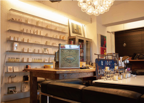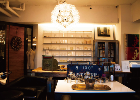 まず1つ目、店舗に入ってすぐのゾーン。タイル敷の床と特徴的なシャンデリア、正面の壁は一面棚。真っ白の壁に、ヴィンテージの什器や家具がよく映えます。真鍮やアイアンのハンガーラックや什器を置いて、自分でセレクトした服やアクセサリーのお店を開けたらきっと素敵だろうな、と想像も膨らみます。