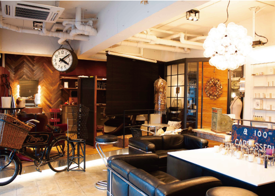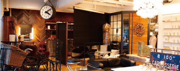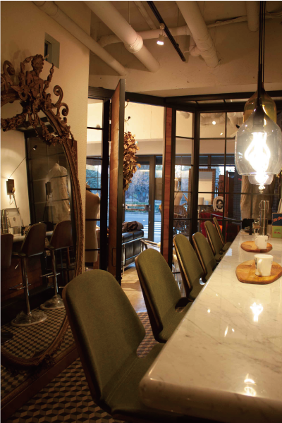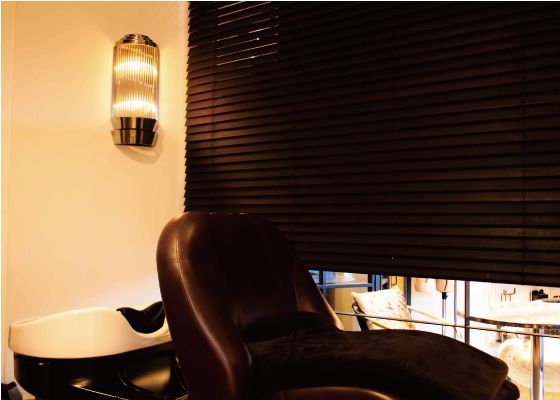 2つ目は店舗左側、ヘリンボーン柄の壁とフローリングの、一段高くなったゾーン。こちらはなんと、美容室の機能を備えています。鏡とスタイリングチェア、カラー剤の為のスペース、木製のブラインドの裏にはちゃんとシャンプー台もありますよ。