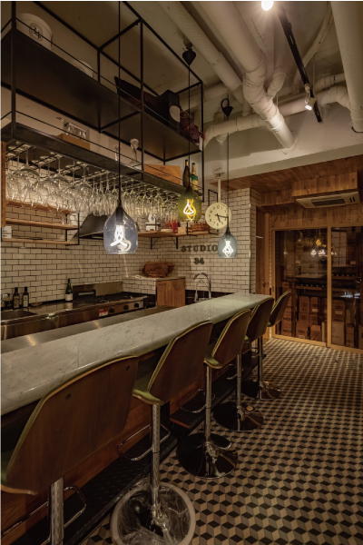 3つ目は、室内ドアで区切られた1番奥のゾーン。 中央には最大6人まで座れる、大理石の天板のバーカウンター。 カウンター上の吊り戸棚には、グラスホルダーもついています。