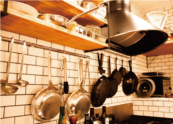 白いタイルが貼ってあるキッチンは広々とした3口コンロ。吊り戸棚だけでなく、壁面にも調理器具を吊り下げて収納する事ができる様になっています。