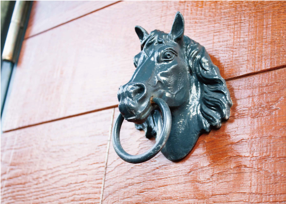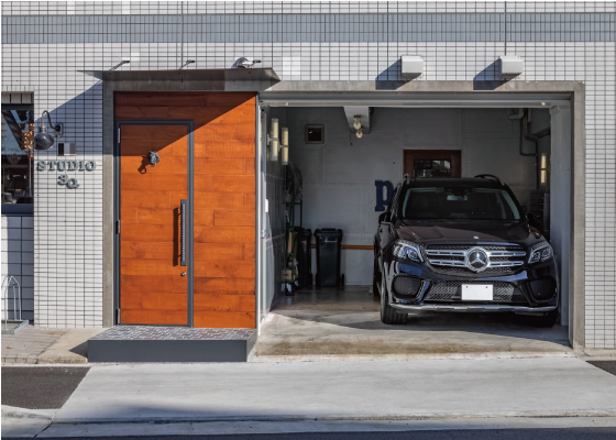ウッドデッキ横には、ヴィンテージ風のノッカーがついた扉が。この扉は店舗内とガレージへと繋がっています。シャッターもついているので大切な愛車も安心して保管できそうです。