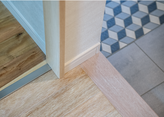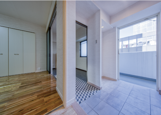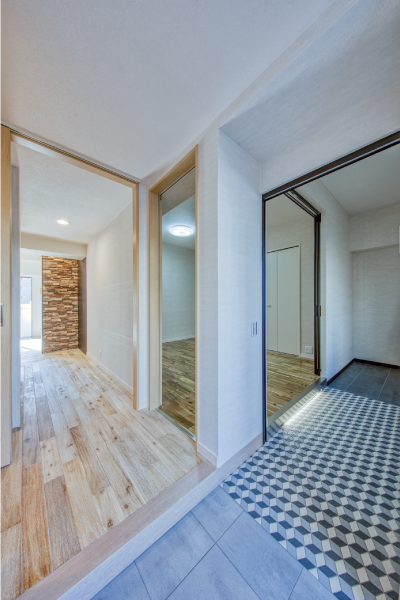 明るい色の廊下のフローリング、洋室の落ち着いた濃い色のフローリング、柄、素材の違うタイル…。沢山の素材が隣り合わせになっているのに喧嘩をせず、それぞれの素材の良さを活かしながら、表情豊かな空間を演出しています。