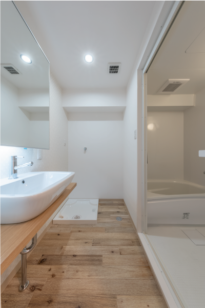 洋室の向かい側には、浴室と脱衣所。廊下と同じ明るいフローリングと、ぽってりと丸みのある洗面台。