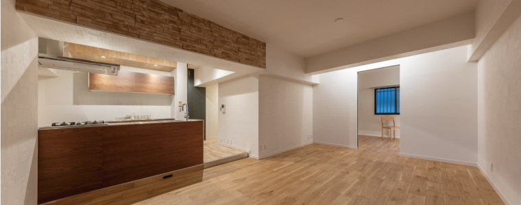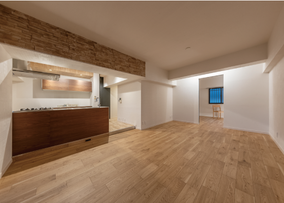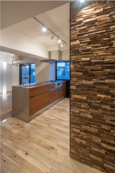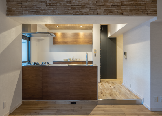 廊下を進むとキッチンの一角にシックな色のウッドパネルが、アクセントクロスの様に貼られています。